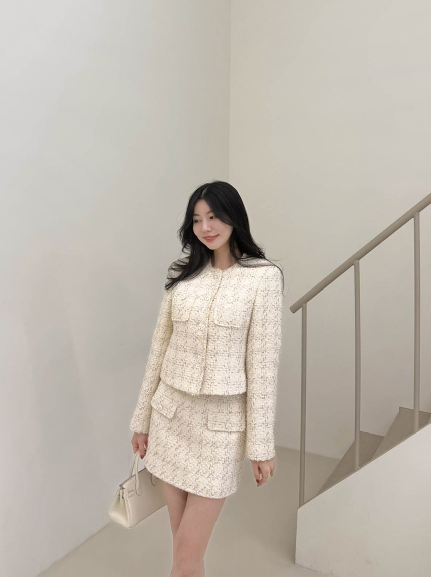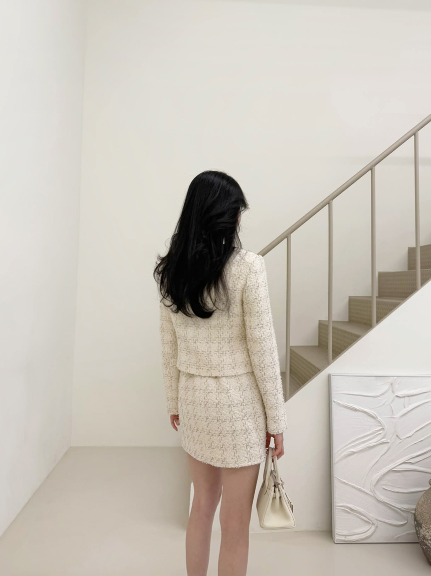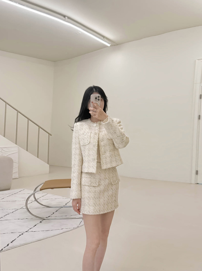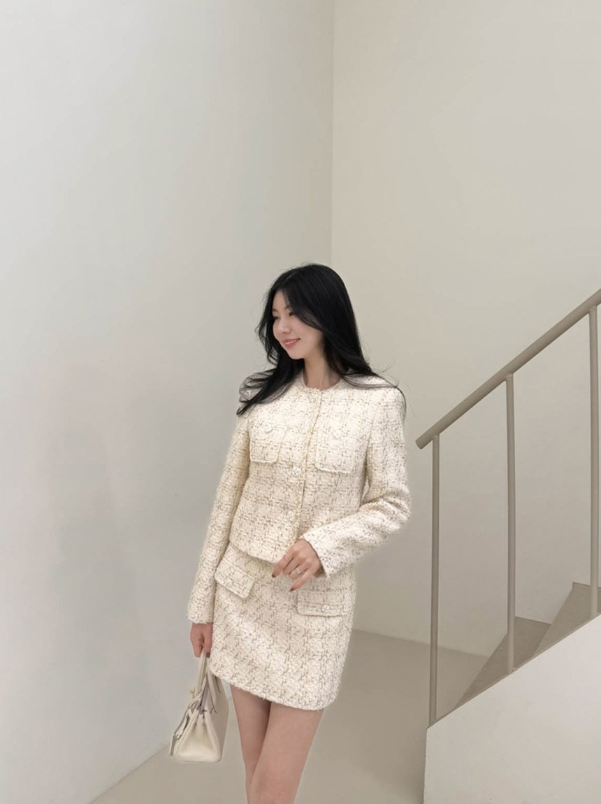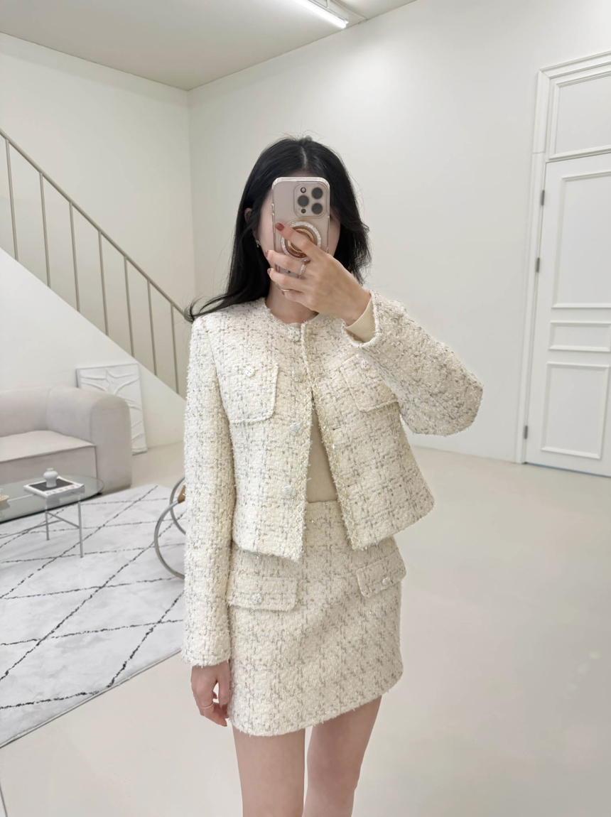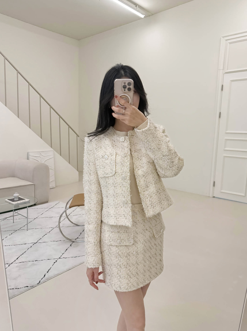 펄 트위드 원단감과 실버 버튼의 고급스러운 무드와