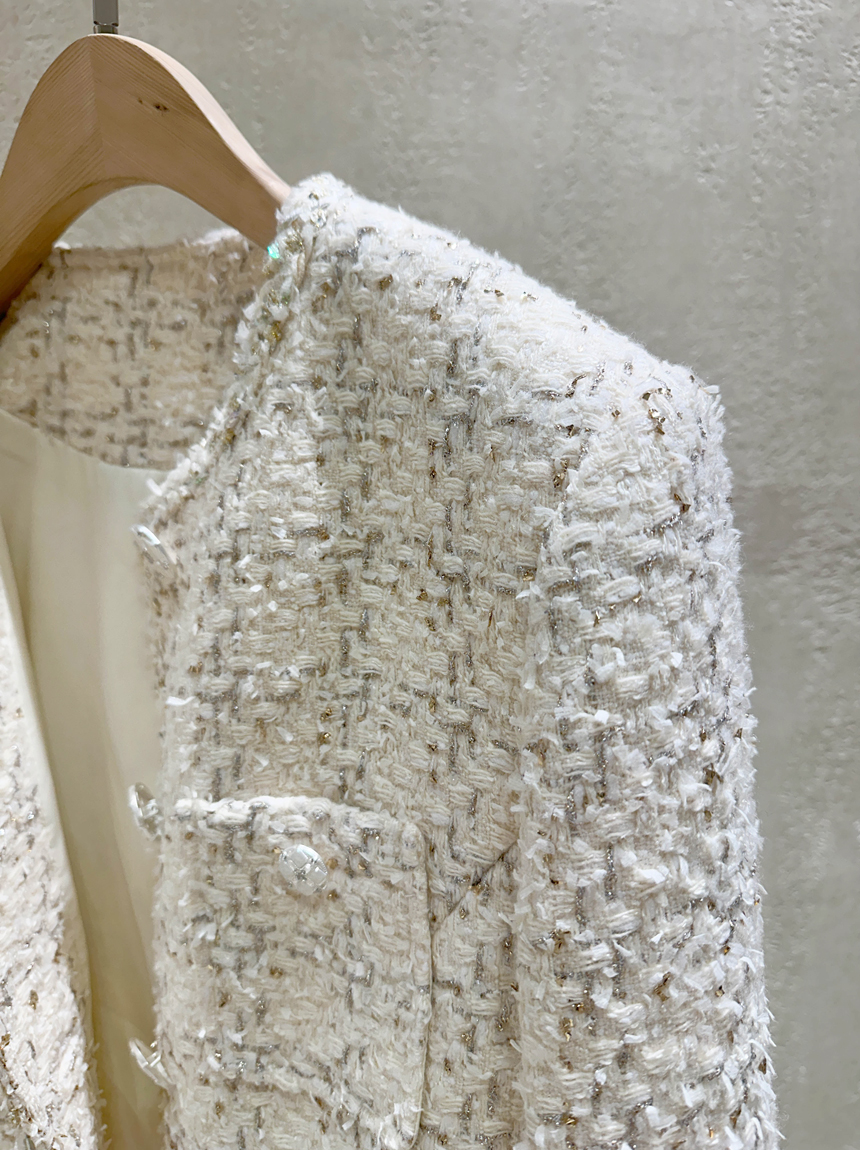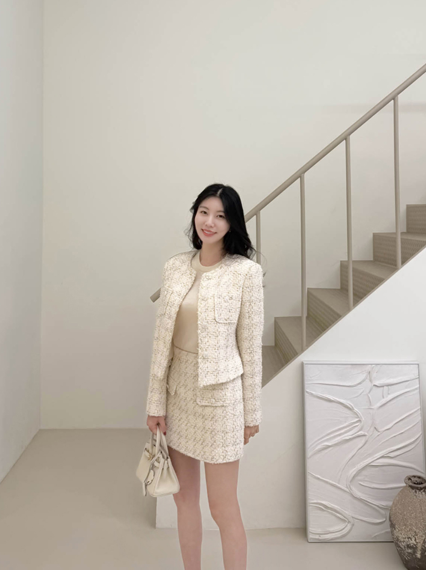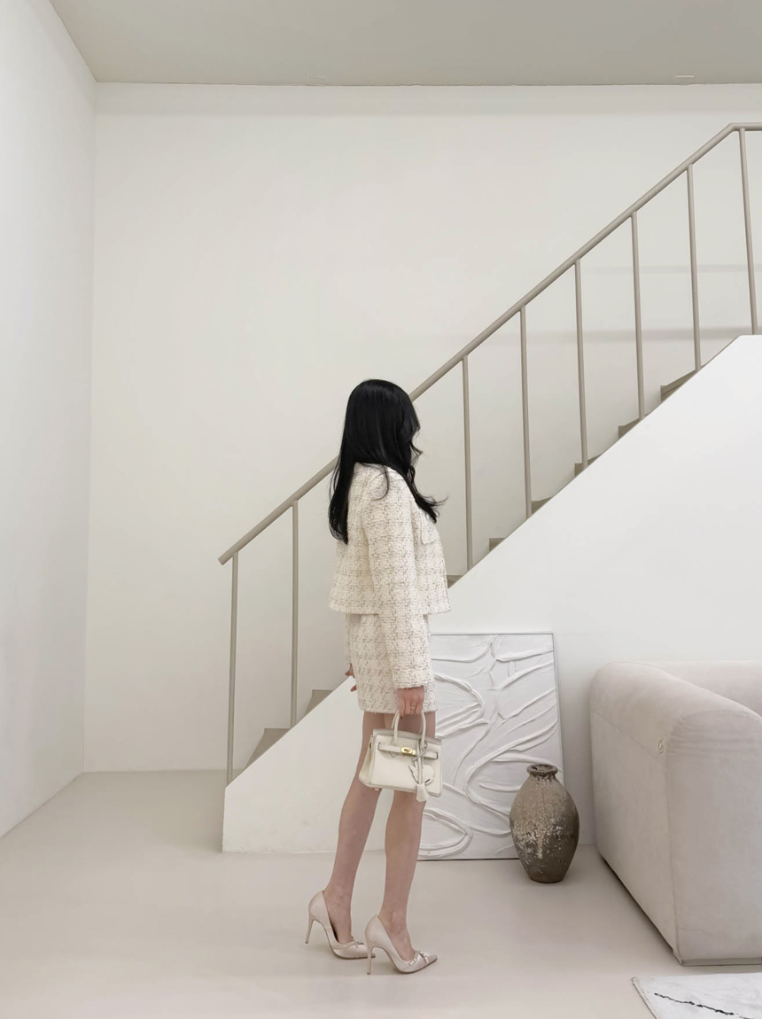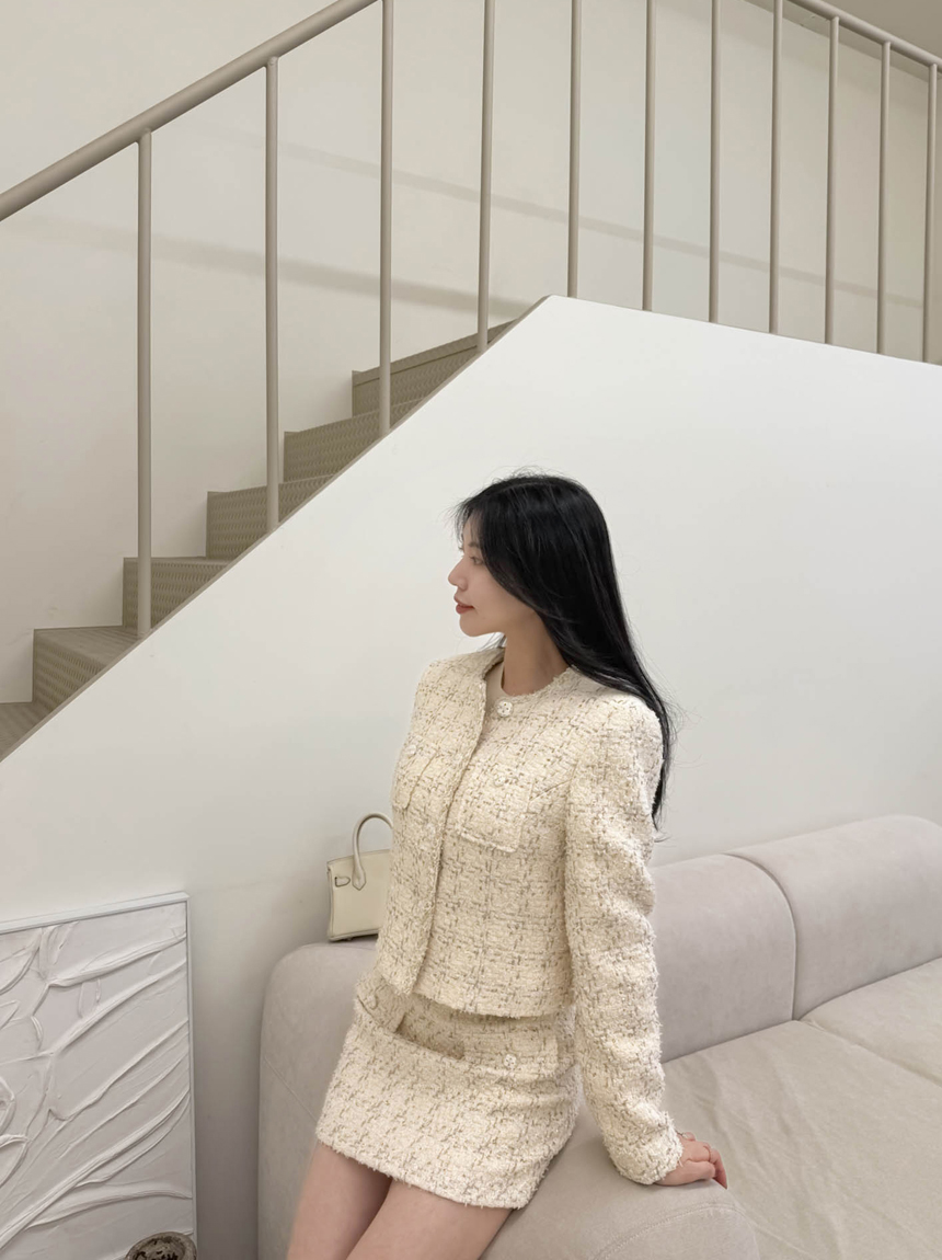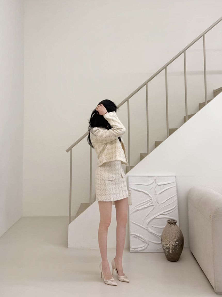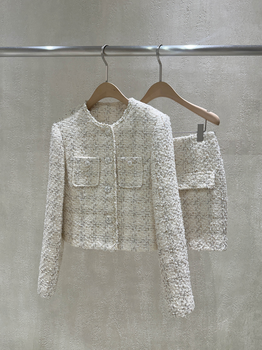 펄 트위드 원단감과 실버 버튼의 고급스러운 무드와
