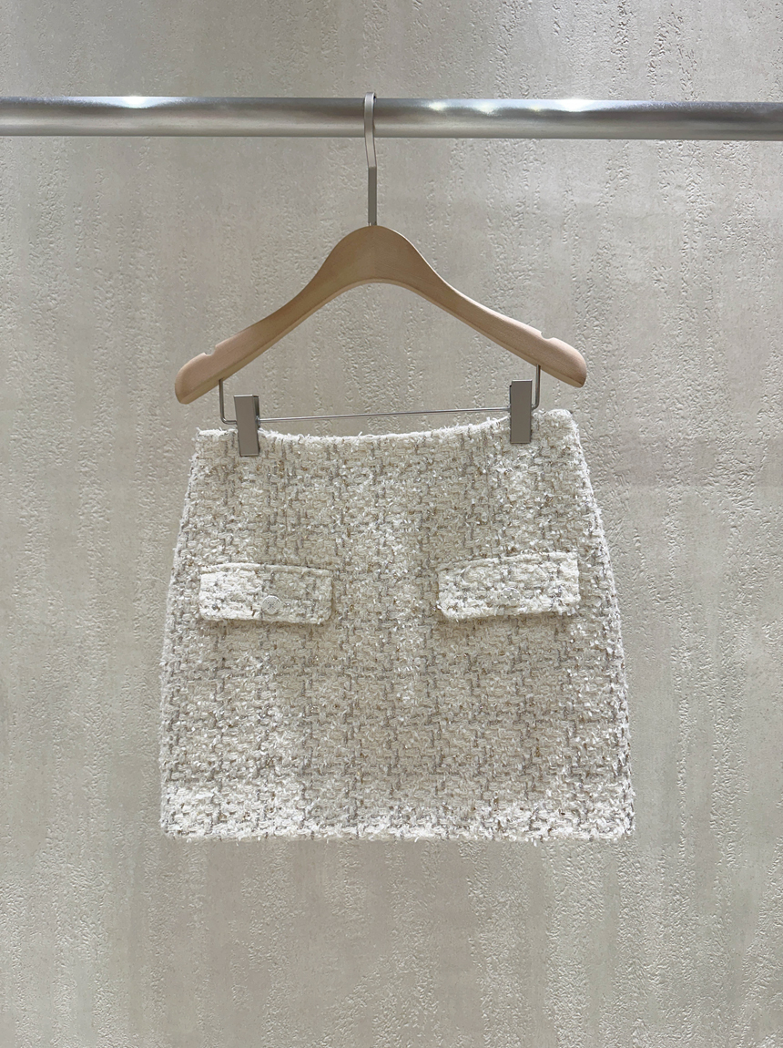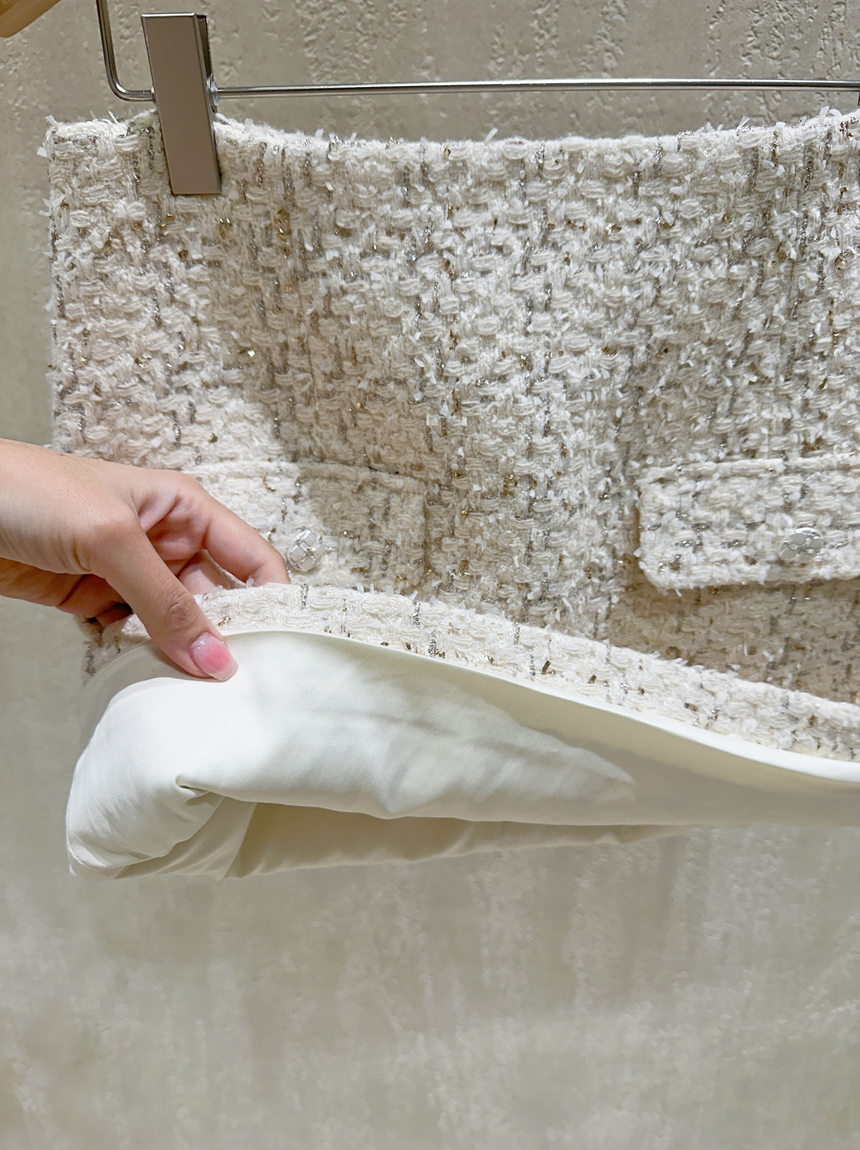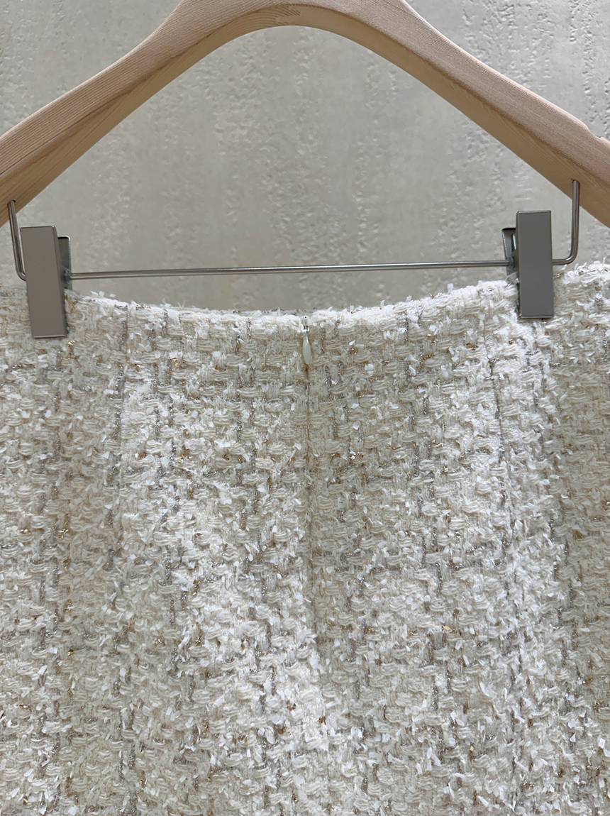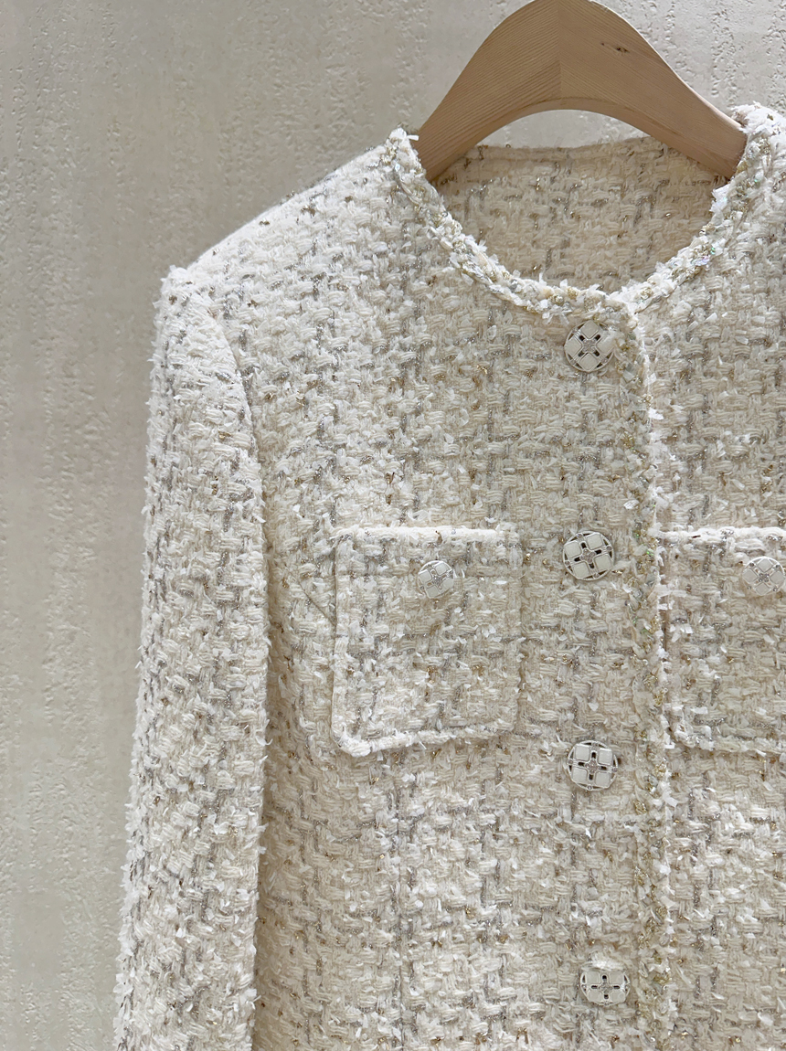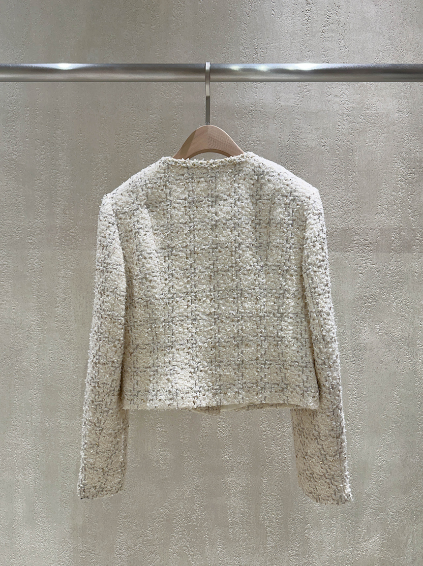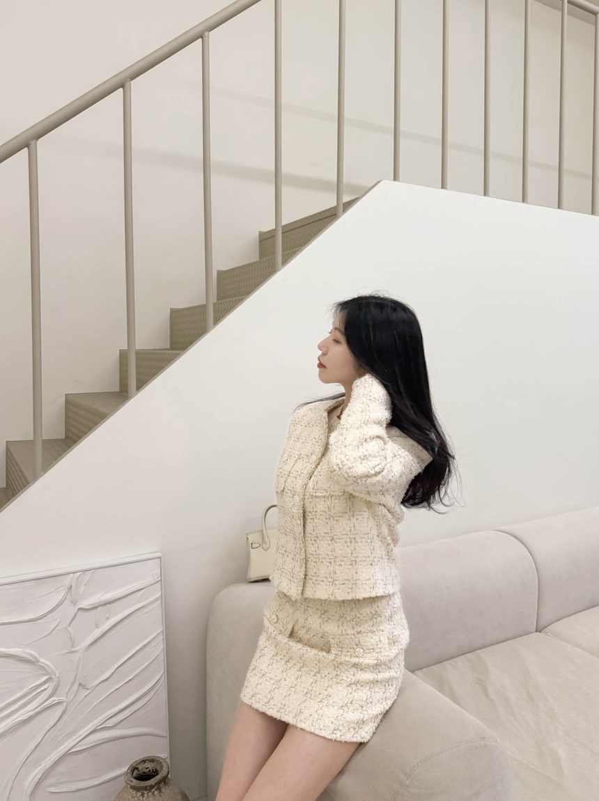 펄 트위드 원단감과 실버 버튼의 고급스러운 무드와