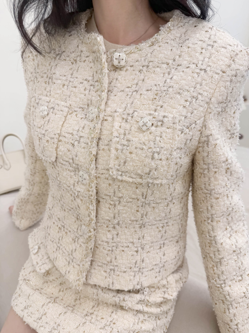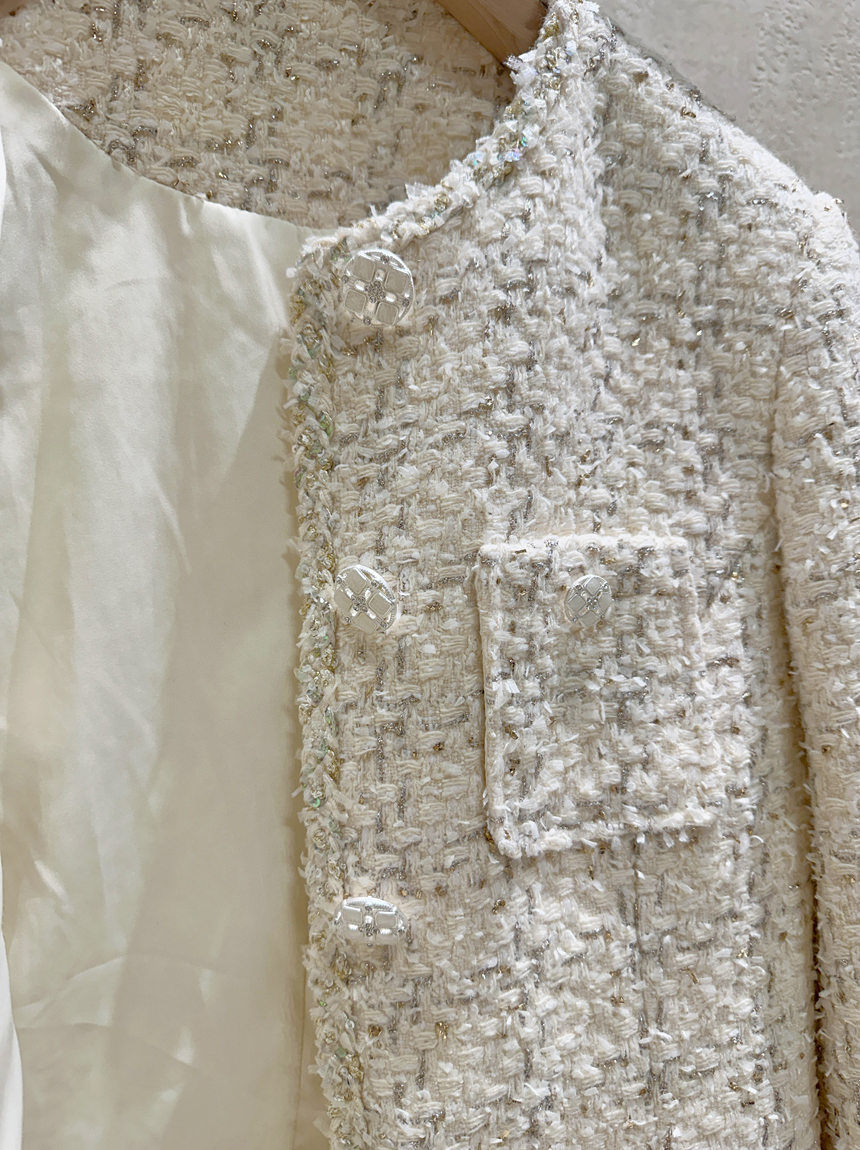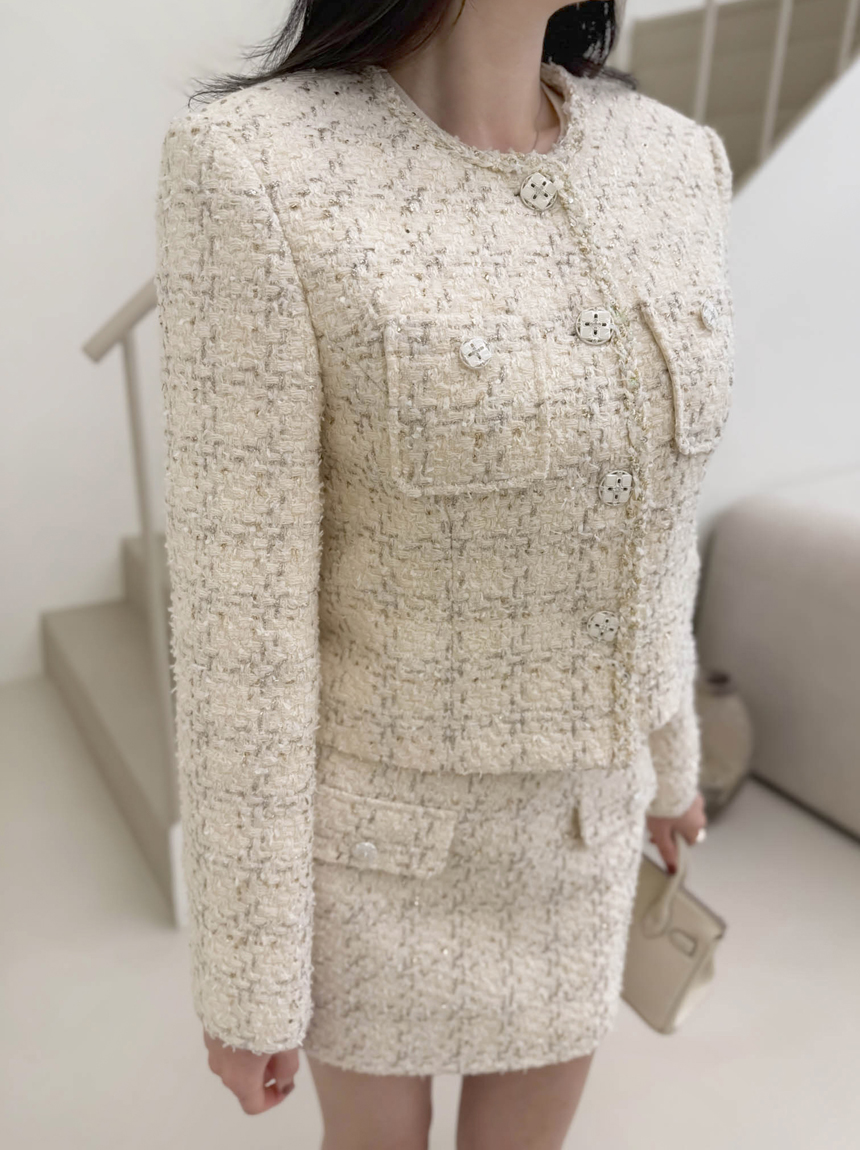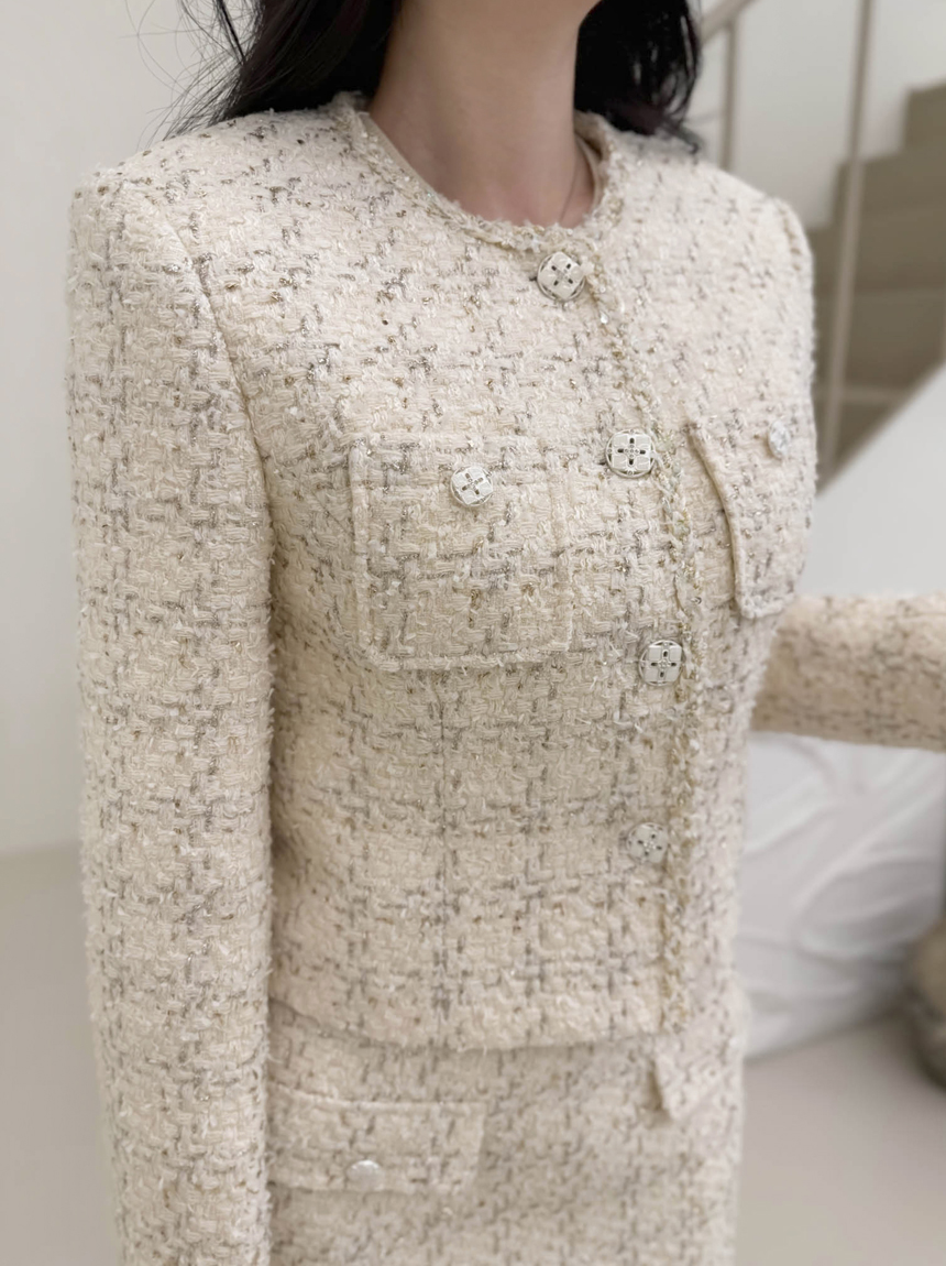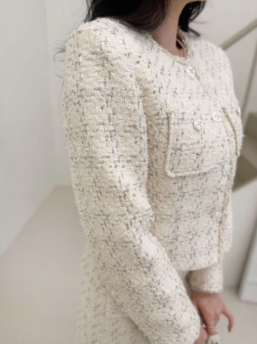펄 트위드 원단감과 실버 버튼 디테일로