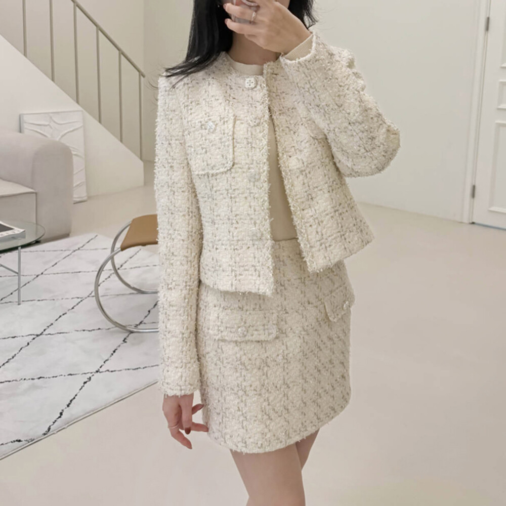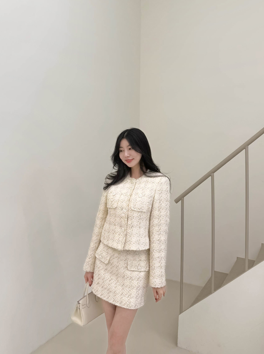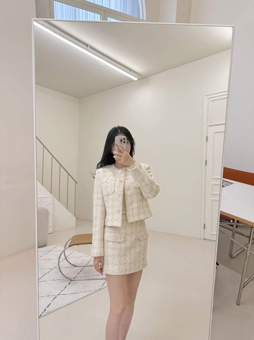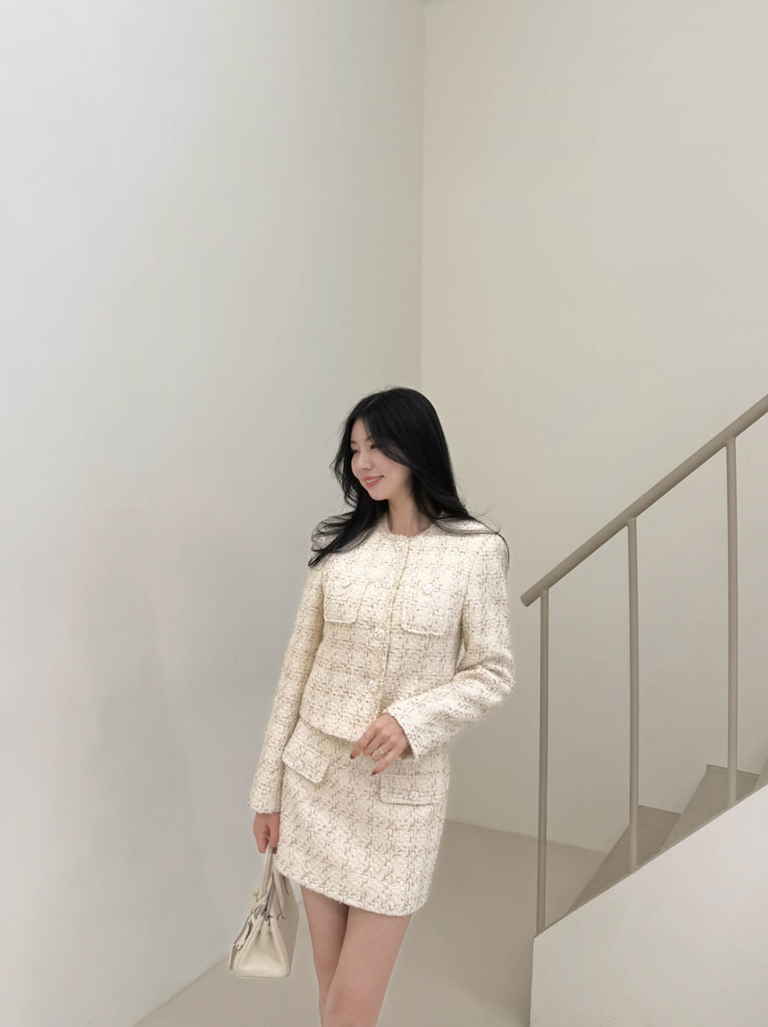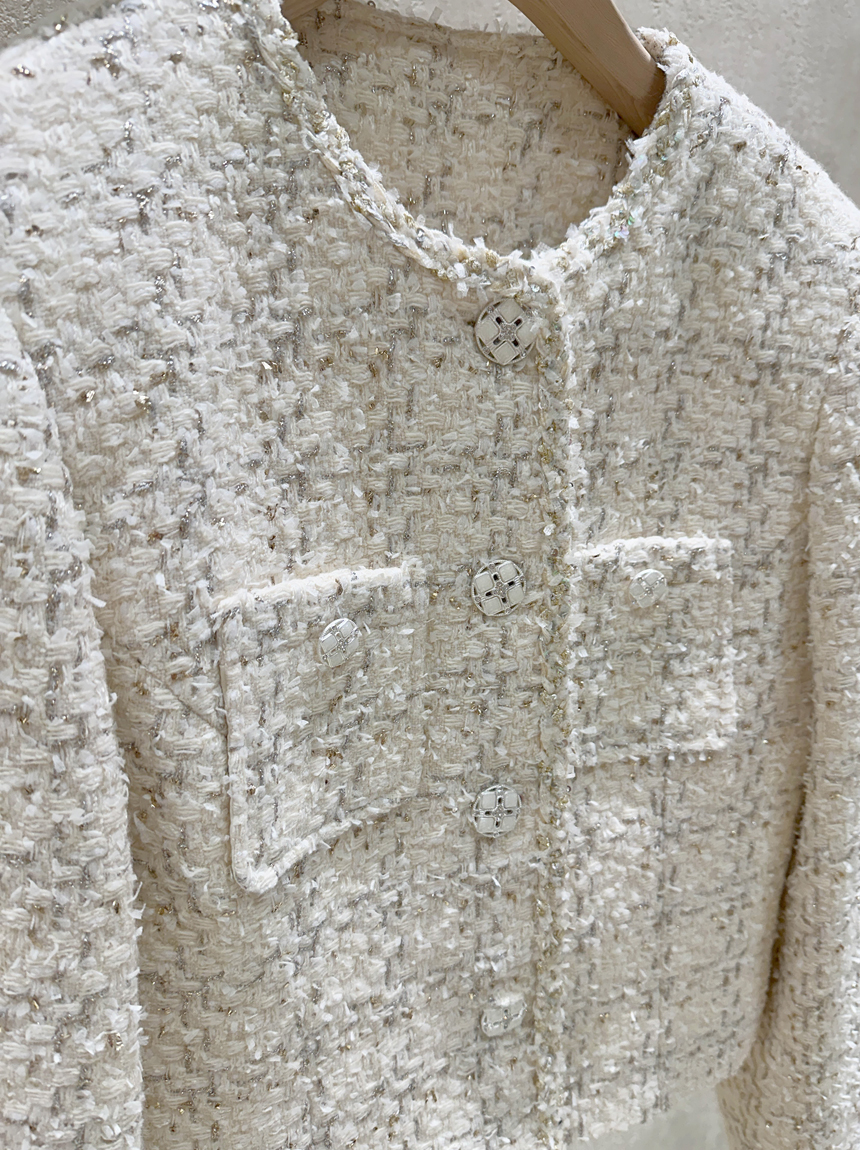 펄 트위드 원단감과 실버 버튼 디테일로