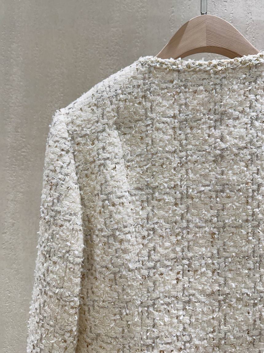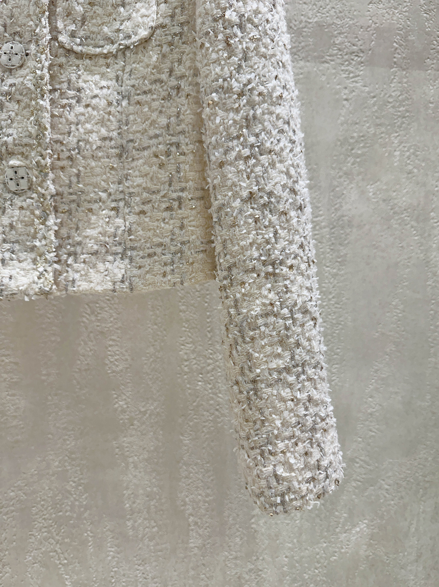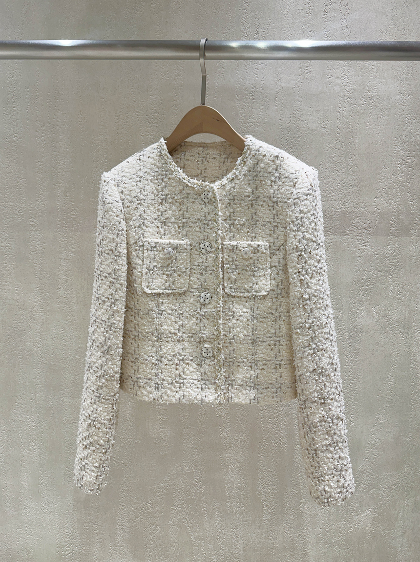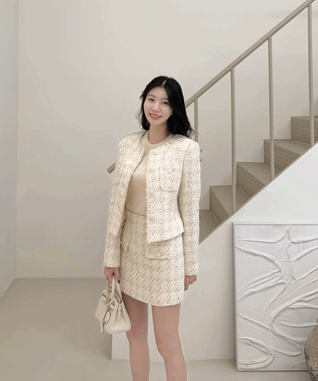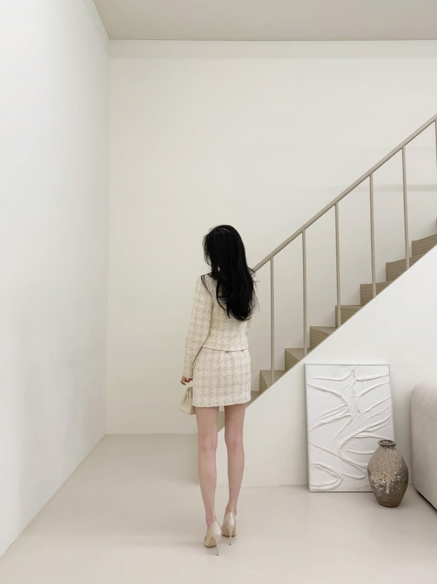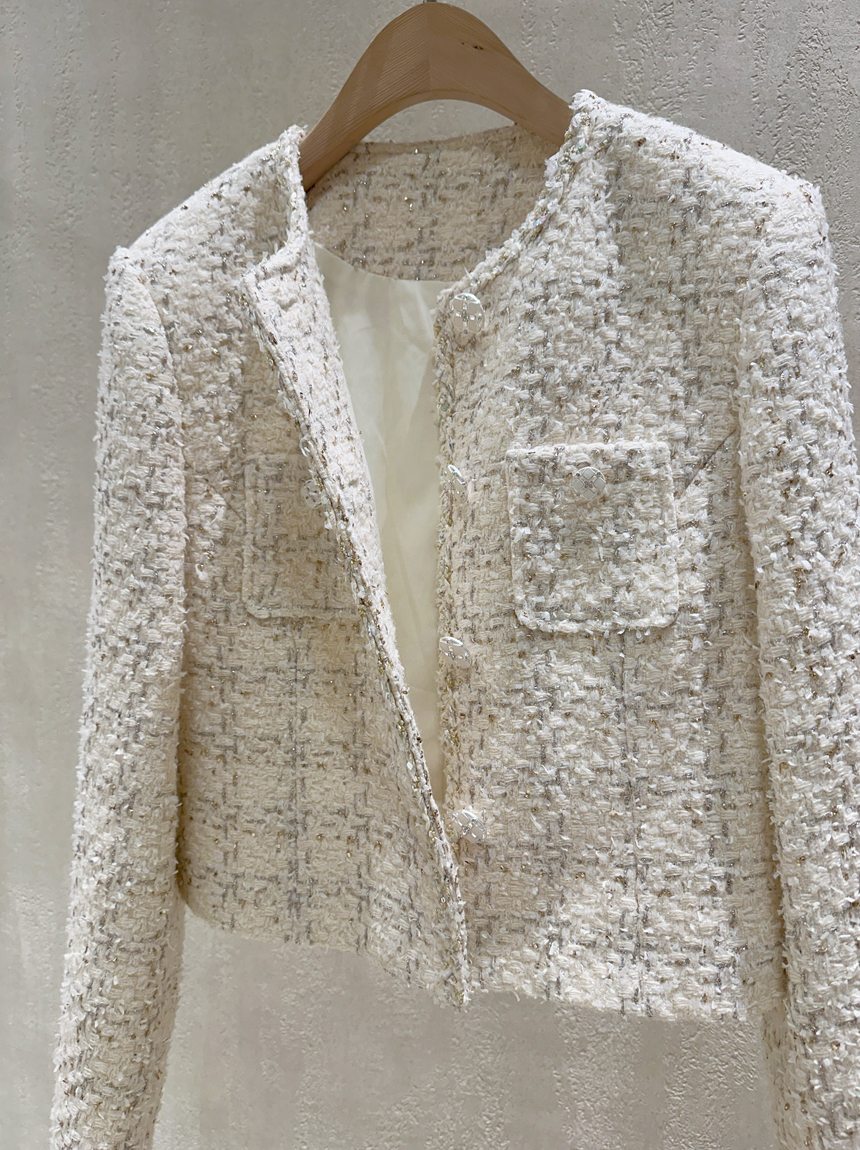 펄 트위드 원단감과 실버 버튼 디테일로