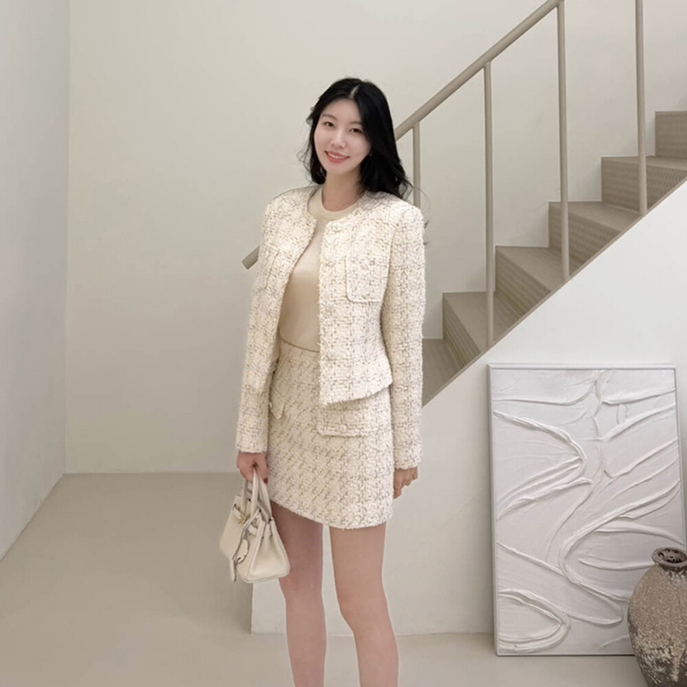 펄 트위드 원단감과 실버 버튼의 고급스러운 무드와