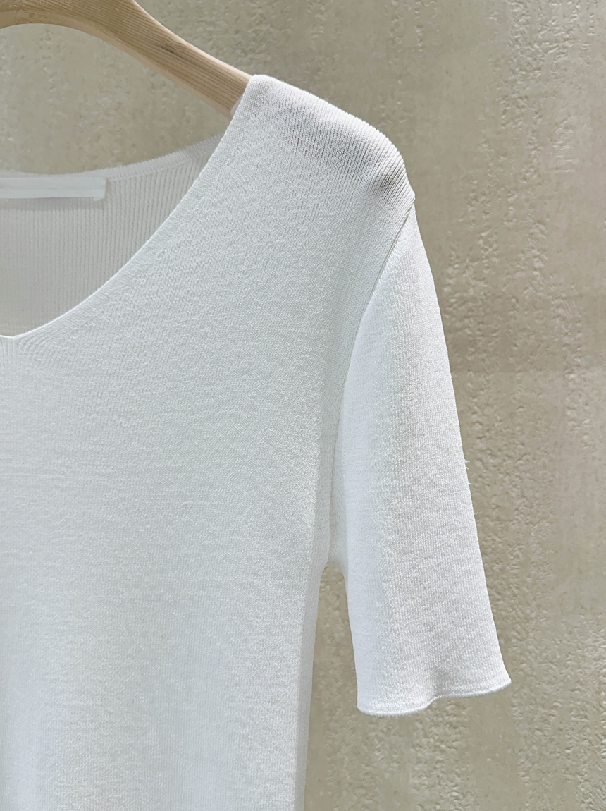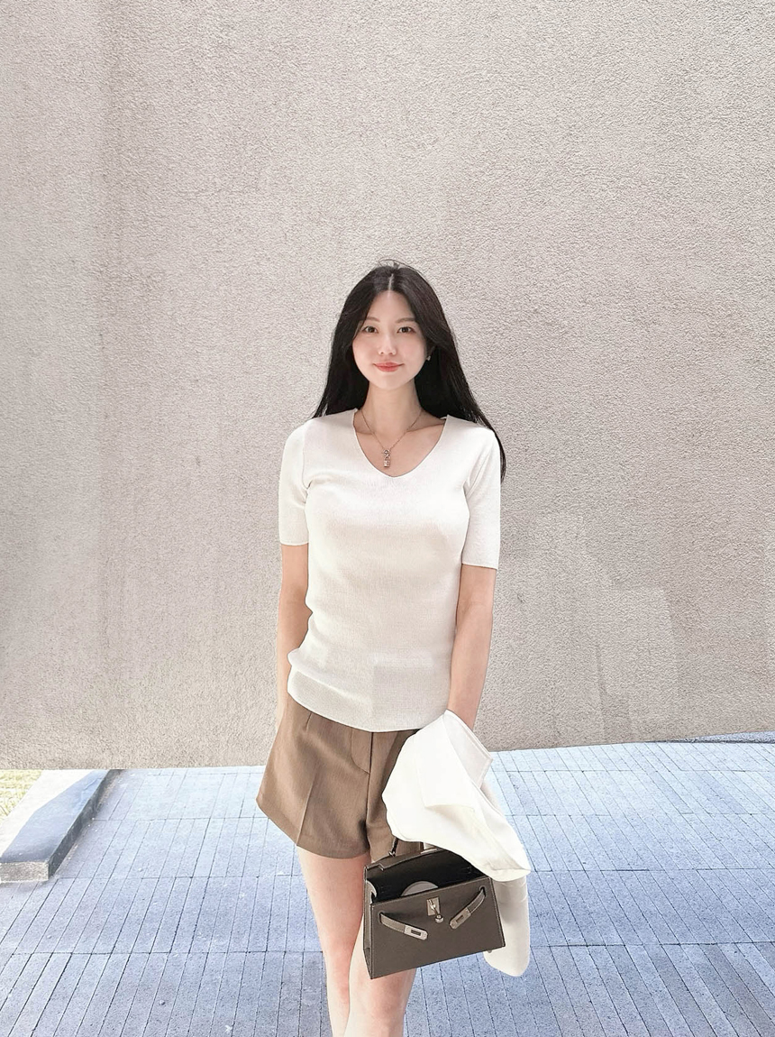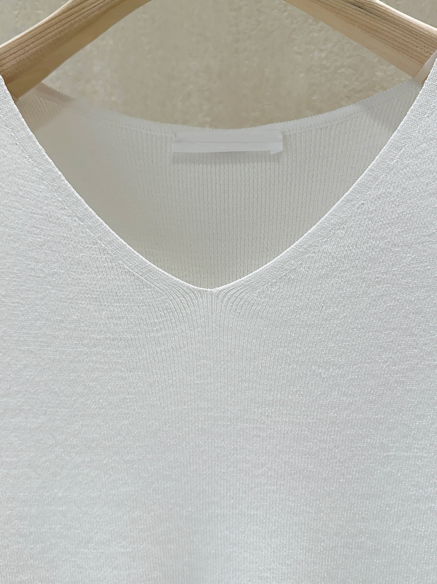 브이넥으로 목선이 길어보이도록 연출해주어