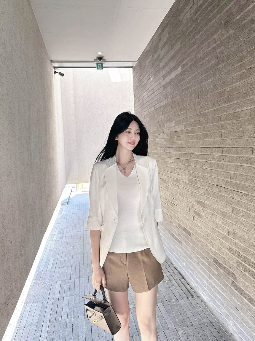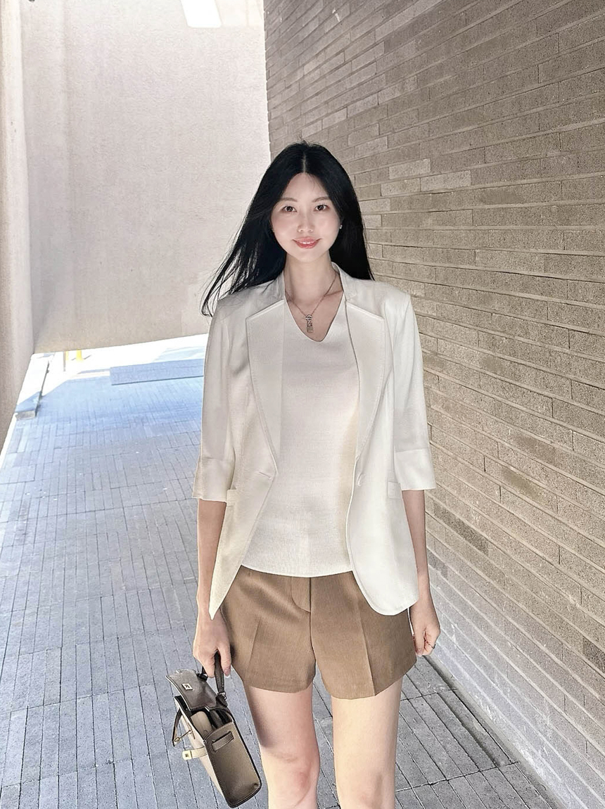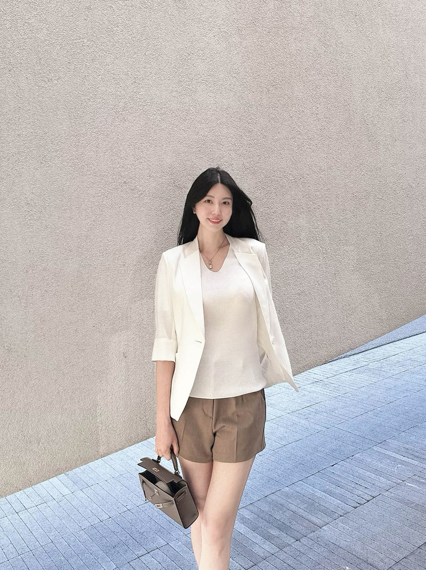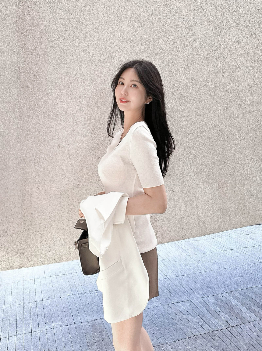 브이넥으로 목선이 길어보이도록 연출해주어